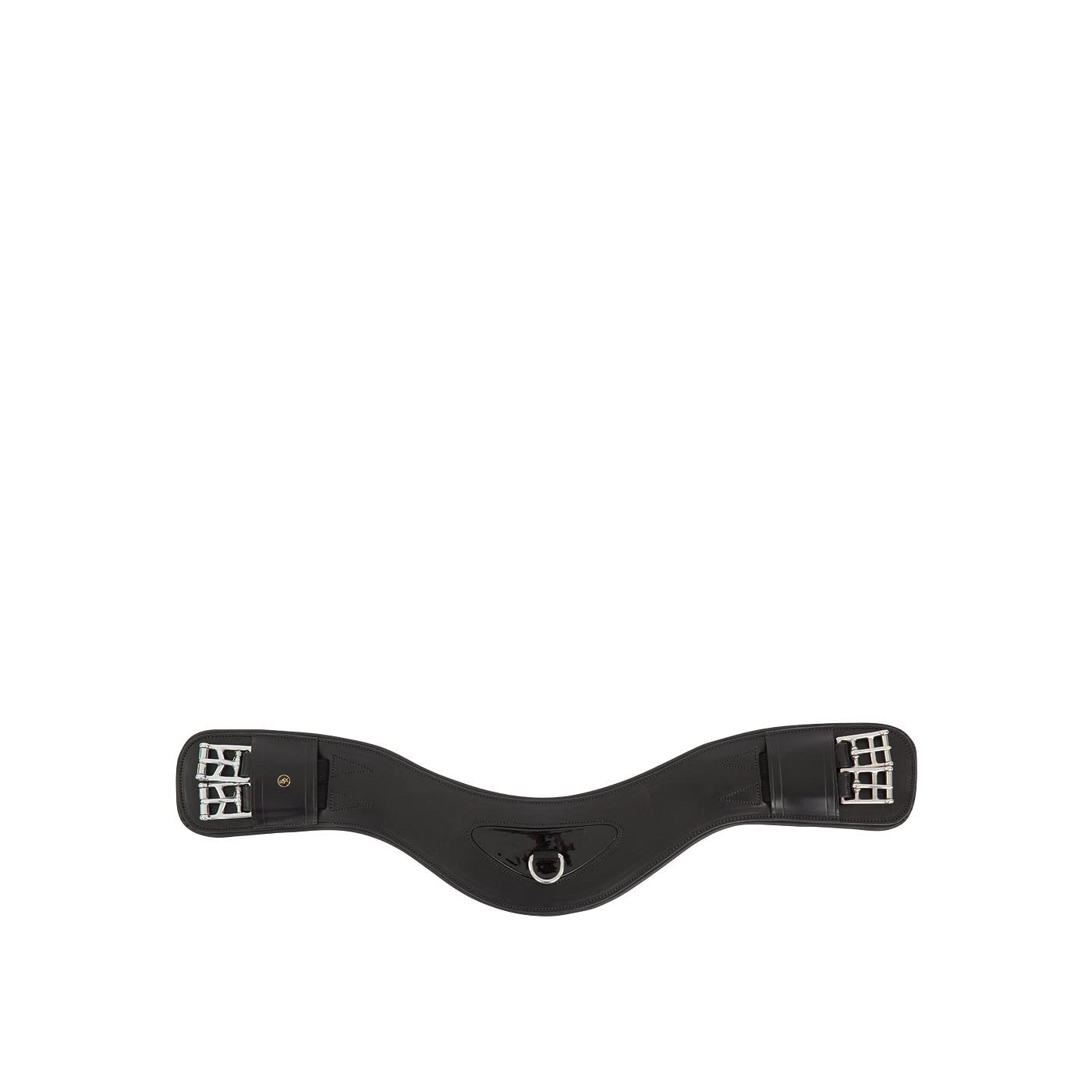 Anatomically shaped leather dressage girth. The anatomic shape of the girth gives the horse maximum freedom of movement. The elastic inserts offer extra comfort and make it easier to girth your horse. When using a martingale or draw rein with a snap hook, it can easily be fastened to the D-ring. The attatchment site is finished with patent leather. The girth has stainless steel roller buckles and broad leather loops to keep the billets in place.