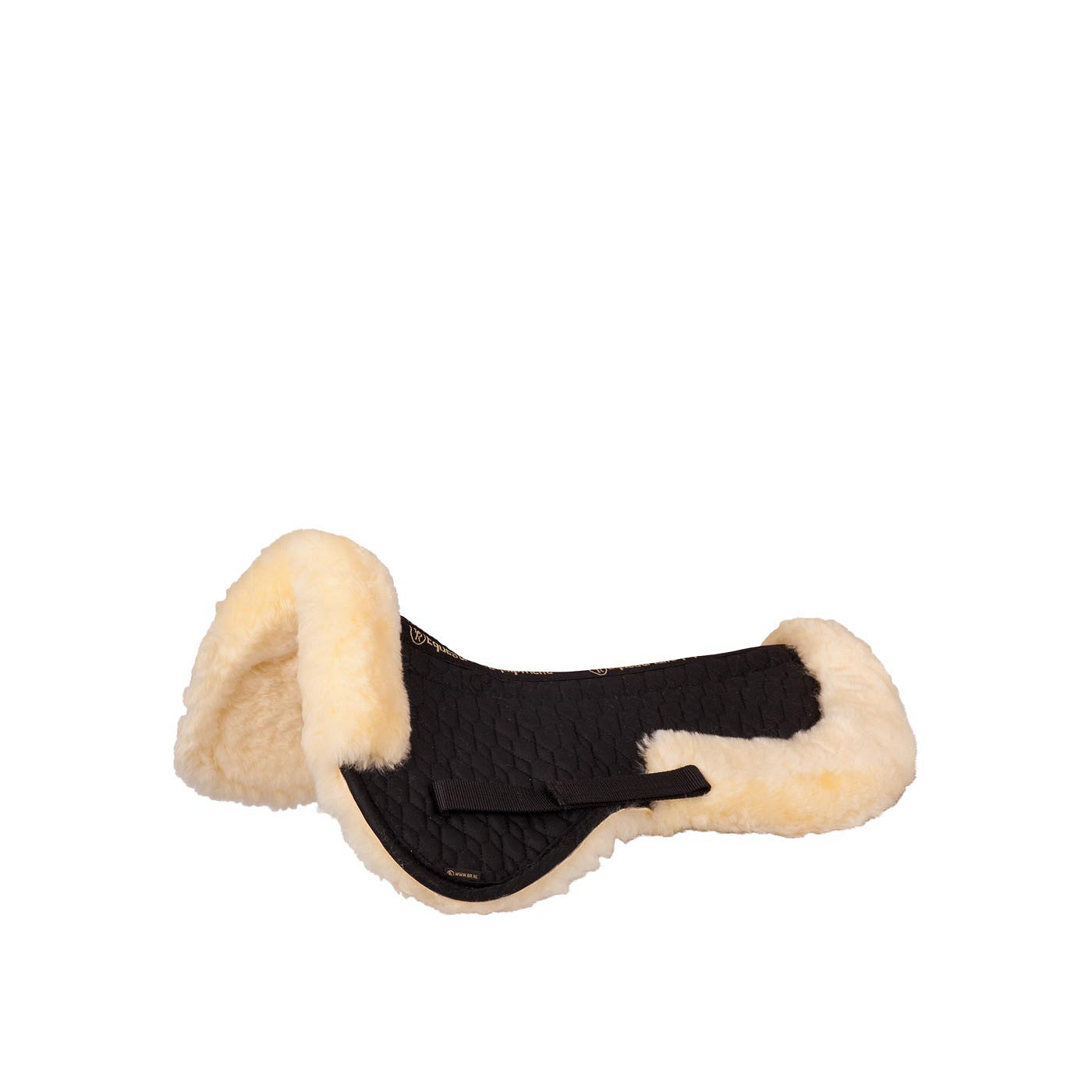 Cotton half pad with medicinal sheepskin underside and border. With cut-away for the vertebral canal.