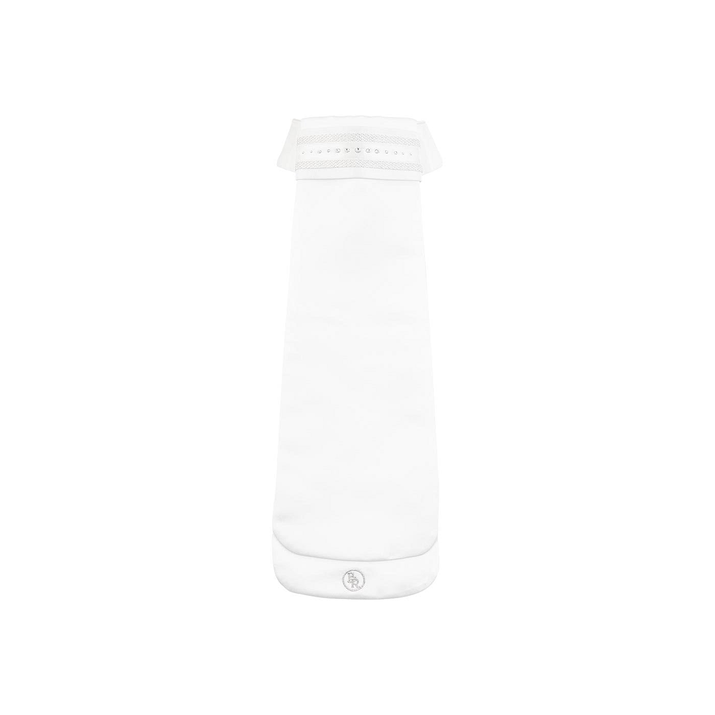 Luxe plastron vervaardigd van een mooi glanzend satijn. De plastron is in het midden gedecoreerd met zilveren glitter mesh en een satijnen band met imitatiediamanten. De plastron is aan de onderkant voorzien van een zilverkleurig geborduurd BR-logo.